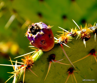 When I snapped this photo of a species of prickly pear in Sedona, Arizona recently, I was focused on the fruit and didn't notice the beauty of the spines until I examined the photo in more detail later. The fruit is nice, but to me the real beauty and elegant design is in the spines. Beautiful as they are, their function is primarily to cause pain. I've had a couple of painful encounters with prickly pears before--including digging into one of the fruits in the wild without noticing that in addition to the big spines, there are lots of very fine ones. A real pleasure to have those in your mouth. It took a day or so for that to go away.