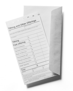 First we obtain a tithing slip and envelope. They are available somewhere in our local meetinghouses, usually in a small holder close to our local leaders' offices. We compute our tithing ourselves and fill out a tithing slip. There are many different funds we can contribute to in addition to tithing. The tithing slip has two sheets, one of which is a carbon. The carbon becomes our initial "receipt." See the image below: