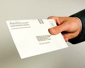 We place our money and the top sheet of the tithing slip into the provided envelope and seal it. In the image below, notice that there is a full address for the local leader of our congregation. There are lines for a return address and a box for a postage stamp.