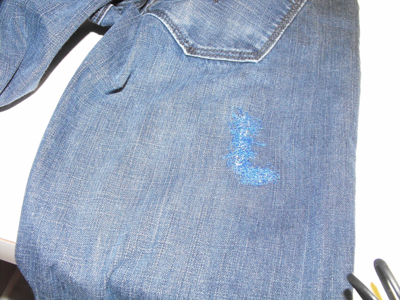 I have a wonderful son who is very busy with work, his dating life, and planning his future. I heard this little tidbit this morning "MOM!!! I need you to fix my pants!!! Well, to his credit, he did ask me to do this a few days ago, but I was busy at work and I didn't write it down. Well, I wanted to show you a technique that a wonderful lady named Marylou taught me years ago. I'm sure you can see the repair. That is because I choose a thread that was a little different than what I needed to use......so that you could see it. Don't worry, after a few washings, you will not be able to see it. It is also very strong, and the repair will probably last longer than the jeans do.