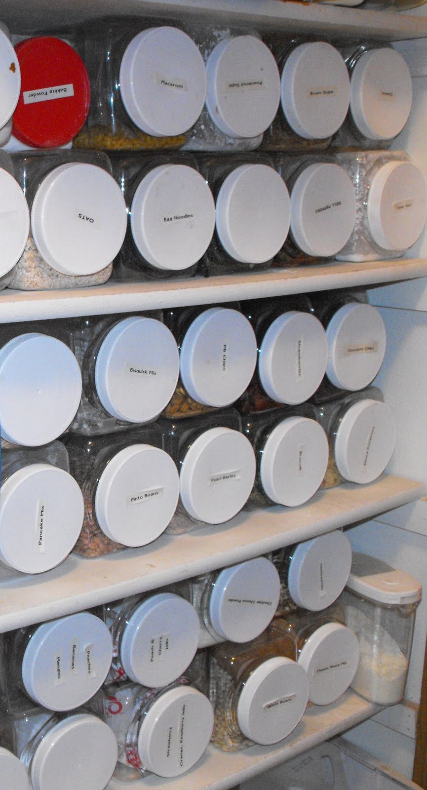 Are you still guessing? Well, I can fit 16 of these containers on the same shelf with a little room to spare. See the tall container on the 3rd shelf? This, again is a snapshot of my pantry. I actually have a 42 of these containers. Each contains a different food storage staple ranging from noodles, dry beans, dried fruit, dried/dehydrated vegetables, powders (i.e. cheese) etc. These containers are very convenient and allow you to more efficiently use your valuable space. Because I do not have to dive into buckets, I actually use my staples. I can easily pull these containers out to when I am cooking.....particularly from scratch.