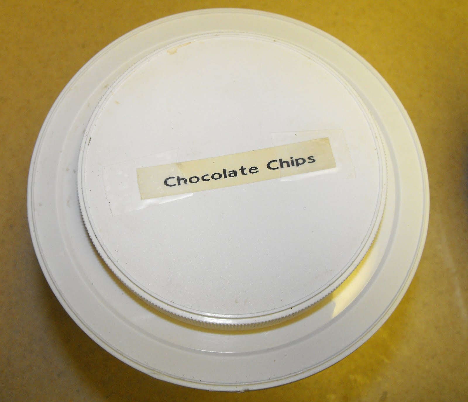 I have a shelf that is 42 inches by 11inches. I can fit seven #10 cans on it so that I can actually read the cans. Above, you see a #10 can (which holds ~ 1 gallon of product). To the right of the can, you see a plastic container with a screw-on lid that also holds a gallon of product (this one just happens to hold Chocolate Chips!). Look at the diameter and height of both of these containers. They are very different. The round container leaves exposed shelf space that is unusable. But look at the shape of the plastic container....square!