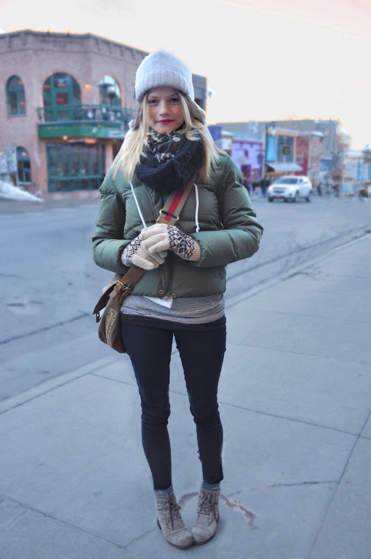 I think this girl is just so cute. Everything she's wearing gives a sporty chic vibe - the mittens, stripe shirt, green puffy coat, scarf, cross-body bag, knit hat and vintage lace-up booties all combine for a fun outdoor look. I'm always looking ways to inject more life into winter outerwear and this girl definitely hit a cool note. I really like how she finished the look with red lips. I think I'll do the same with the next sporty outfit I try.