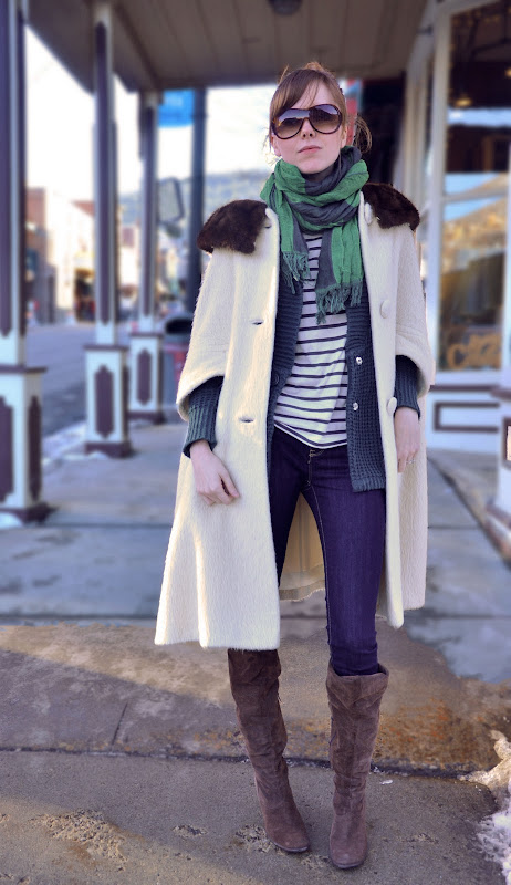 Layering up is key for an interesting winter look. Layering can add color, dimension and texture - all, or most, of which is usually missing in the bundled up depths of January and February. The art of layering is a skill every Modest Girl should take up, as it will take her wardrobe from seemingly limited to limitless. At the Sundance Film Festival this year we wanted to take winter fashion up a notch. Here we have one of our favorite vintage finds - a fur trimmed cape from the 1960's. We decided to layer it up, and dress it down a bit, with a heavy sweater from Urban Outfitters, a nautical cotton top from H&M, boots, from a German shop in Hamburg, and plaid scarf, from a Chinese flea market in Beijing. All the pieces combine for warmth and Sundance style.