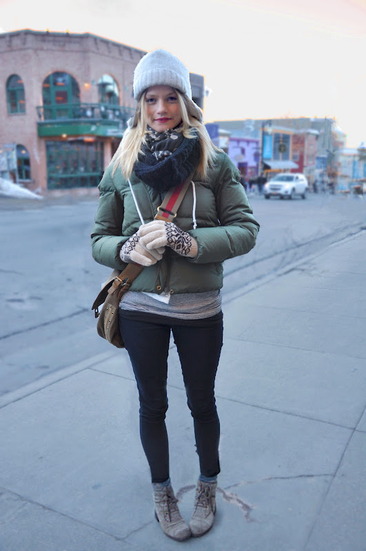 We think the actress Lindsey Pulsipher looks so cute here. Everything she's wearing gives a sporty chic vibe - the mittens, stripe shirt, green puffy coat, scarf, cross-body bag, knit hat and vintage lace-up booties all combine for a fun outdoor look. I'm always looking for ways to inject more life into winter outerwear and she definitely hit a cool note in Sundance fashion. I really like how she finished the look with red lips. I think I'll do the same with my next sporty outfit..