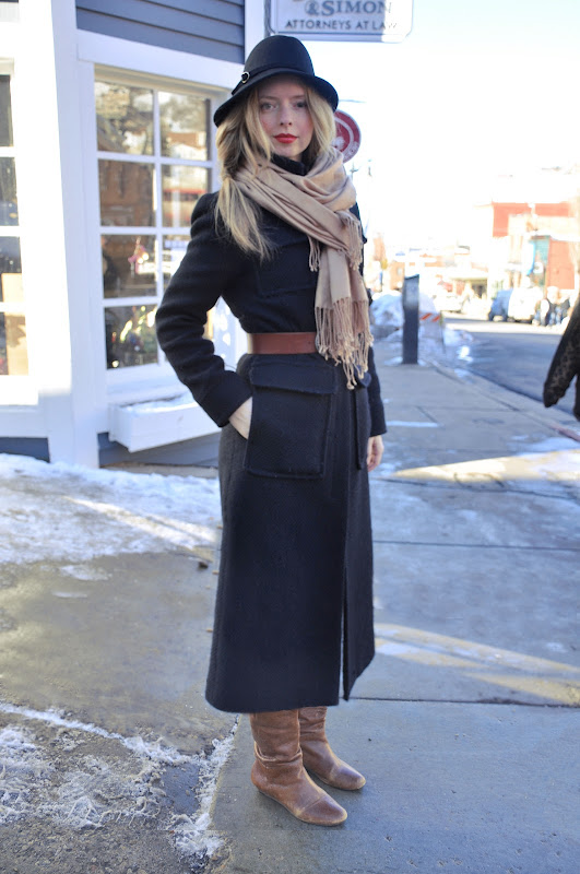 I am channeling my inner True Grit with this look. I recently saw the film, True Grit, and was so inspired by the clothes and hair Hailee Seinfeld sported on screen that I had to recreate elements of her look up here at Sundance. Hailee wore a long wool overcoat, cinched in at the waist with a thick leather belt, hat, braids and boots. OK, so my version is slightly more urban, but I still like to think there is a bit of Old West fashion in there.