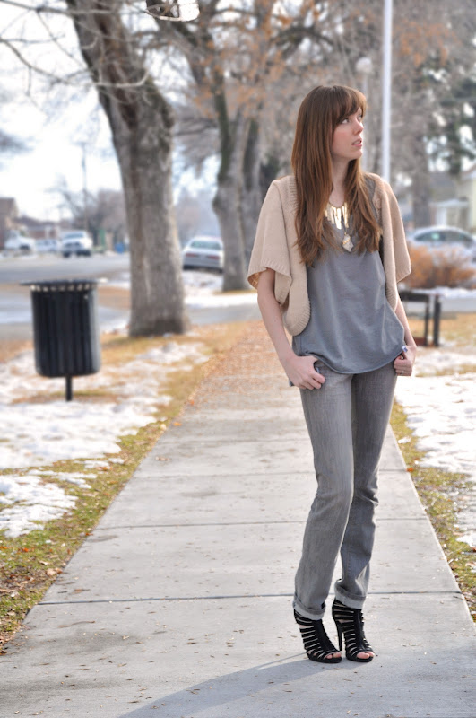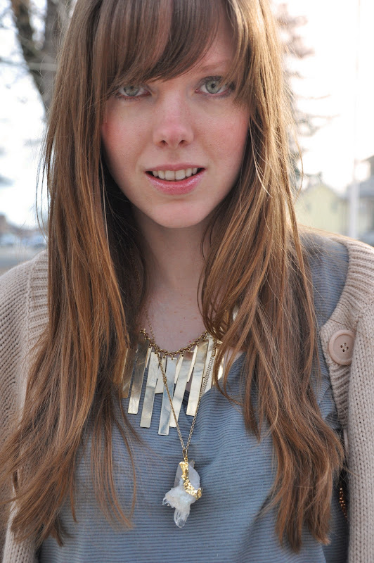 A drape-y little sweater and some gold jewelry can take a baggy T-shirt a long way. This perfect baggy T is from Roxy. I love different shades of pale neutrals paired together into a hazy mix. With the muted palate the gold jewelry definitely stands out but is totally appropriate for daytime, whereas if the gold was paired with black it would scream evening. The quartz and gold necklace shown here was actually mined in the Kennecott Copper mine in Utah and is sold in the gift shop there. The sunburst necklace is Forever 21.