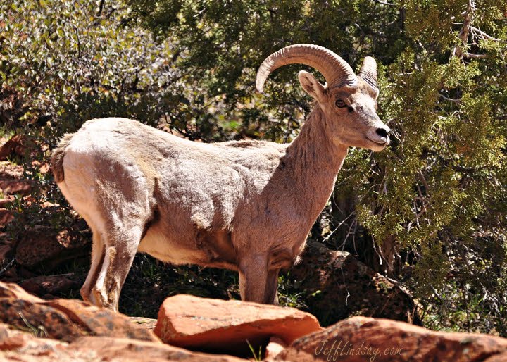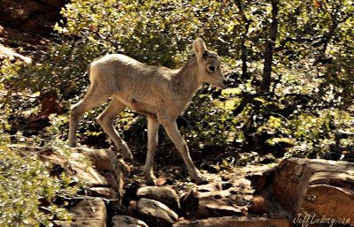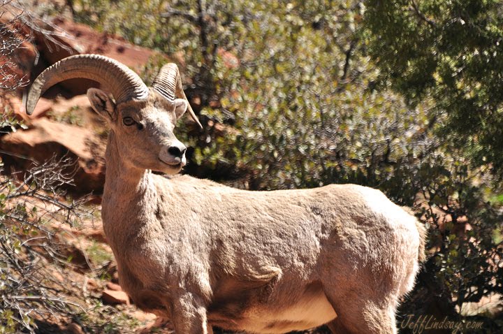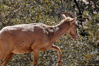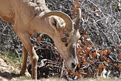While driving out of Zion's National Park last week, a man was parked at the side of the road. He didn't even look at us as we drove by, but did make a simple gesture with his hand to point to something. All he did for me was to literally lift a finger for a second or two. That was enough to call my attention to something barely visibly from the road: a bighorn sheep