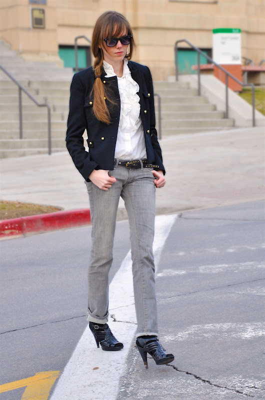 We loved the gray jeans at the Spring 2011 Chanel show and the sharp jackets at the Spring 2011 Moschino show and decided to take this inspiration and interpret it to a 'real life' look. The result is slick, urban, easily wearable and perfect for temperatures that hover in between cold and warm.