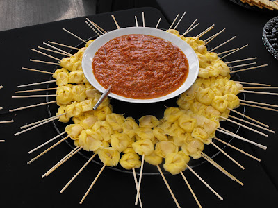 This is Tortellini pasta that was cooked, placed on skewers and refrigerated. The sauce is a bottled Alfredo Sauce. People dipped and spooned away all night eating this entree.