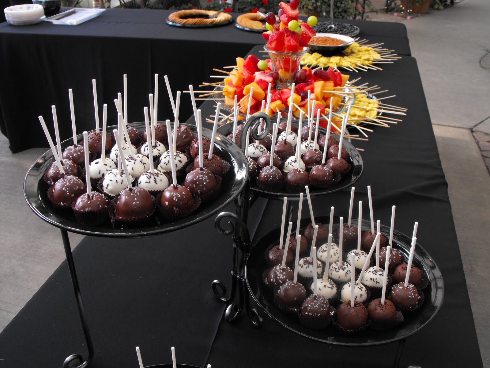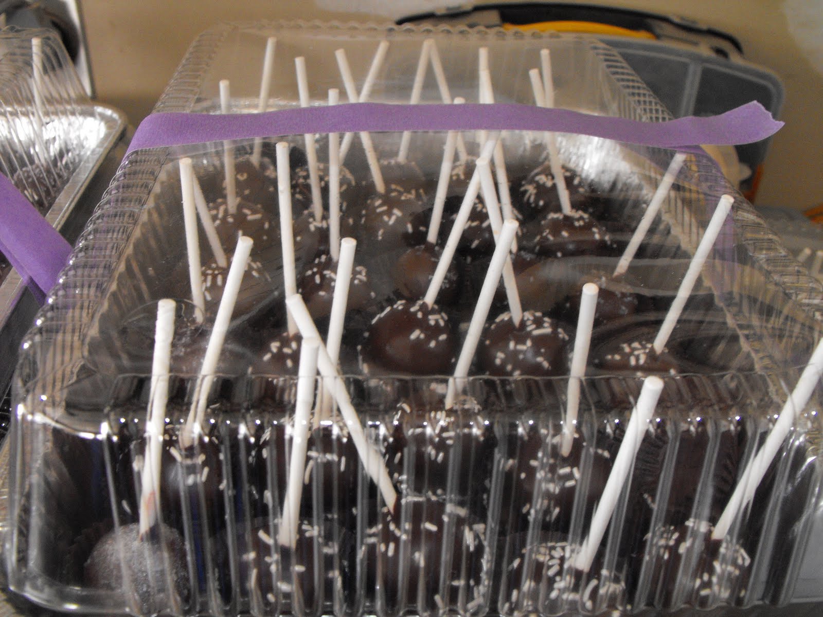 These are Cake Balls. They are very simple to make, but are delicious and make a nice presentation. Here is the recipe.....don't blink! Prepare any cake mix and cook in a 9x13 inch pan. Let cool, and then shred the cake. Take either a package of Cream Cheese or a container of prepared Frosting. Microwave to soften. Then mix the cake with the softened cream cheese or frosting. Roll into ball. Freeze the balls until they are firm...not hard. Pull out of the freezer and place sucker stick inside. Dip into dipping chocolate and adorn with the sprinkles of your choice. These are placed into little wrappers (think Reece's Peanut Butter Cup papers). These are delicious and unique. They were a crowd favorite.
