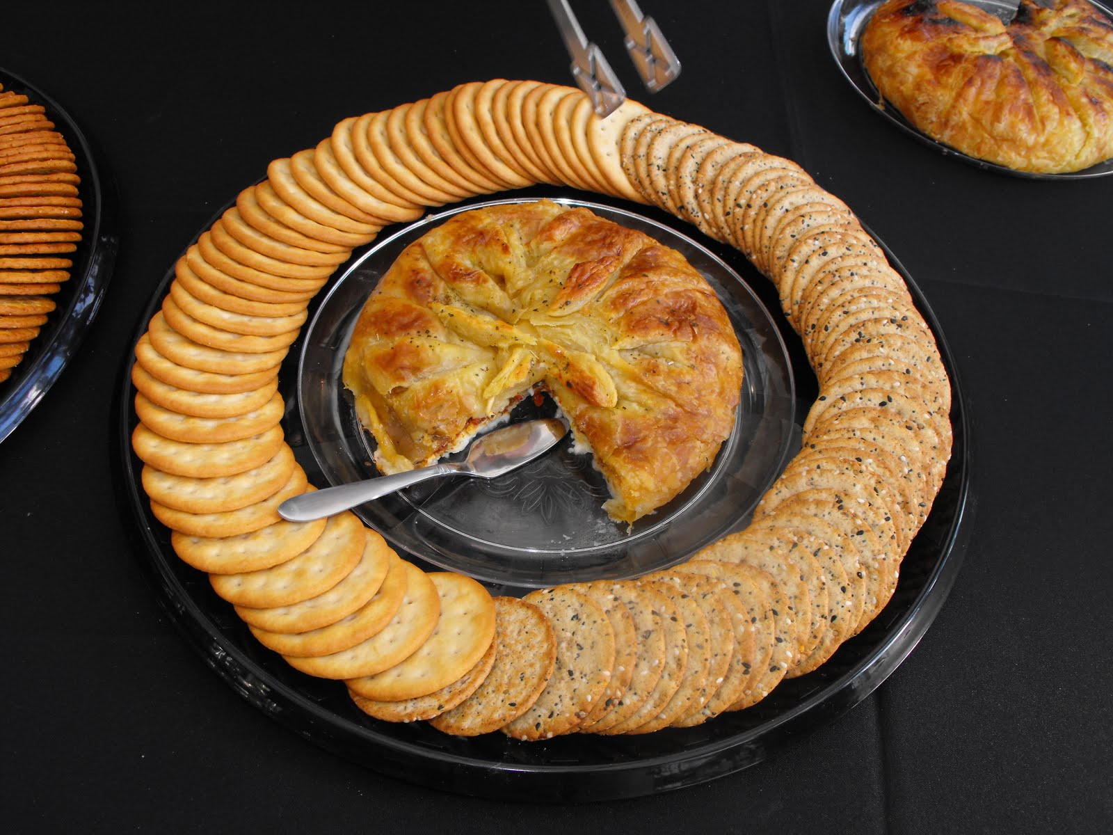 This is baked Brie cheese. Brie and Frozen Pastry sheets are easily found in most grocery stores. Here is how it was served...