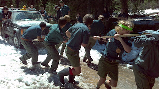 UPDATE: I just got word that they were able to get the staff and vehicles into camp at 4 pm today. There is lots of snow in camp, but it is melting rapidly. As has happened in other heavy snow years, the staff will work at doing snow removal in critical campground and program areas throughout this week. There will still be plenty of snow banks around when troops arrive next week, but they will hopefully still be able to run a regular program.