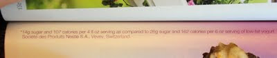 Put away your regular, old plastic-cup yogurt. Yogurt Blends has 46% less sugar and 34% fewer calories* than refrigerated low-fat yogurt....Wow, frozen yogurt has 34% fewer calories? What amazing technology did the food scientists at Nestle invent to do that? Mmmm, the invention wasn't by the scientists--it's an invention of marketing. Look at the fine print in the hard-to-see side of the ad. If you don't flatten the magazine out, you wouldn't even see the footnote: