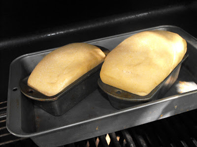 I placed the loaf pans inside another pan. According to the instructions from Preparedness Pantry, the 2nd pan helps protect the bottom of the bread from burning. I placed the loaves on the 2nd shelf away from the flames. As you might imagine, when I opened the grill there was heat loss. I adjusted the burners to bring the heat back to 350 degrees. I turned down the burners when we achieved that level and watched for several minutes to try to ensure that the temperature was maintained.
