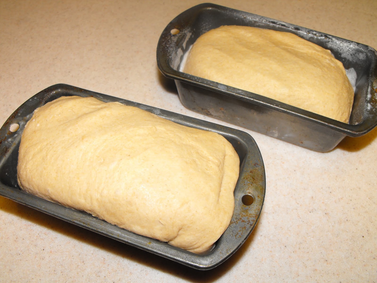I shaped the bread into two loaves and put them into my mini loaf pans. I covered them with a towel and let the dough rise.