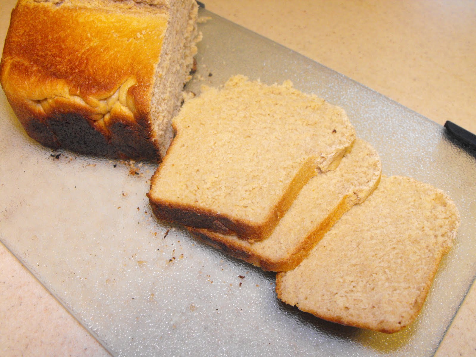 After the bread cooled, I sliced one of the loaves. The bread was moist and cooked all the way through. I quickly took some photos because I wanted to try a slice. The butter melted quickly and the taste....was fabulous.