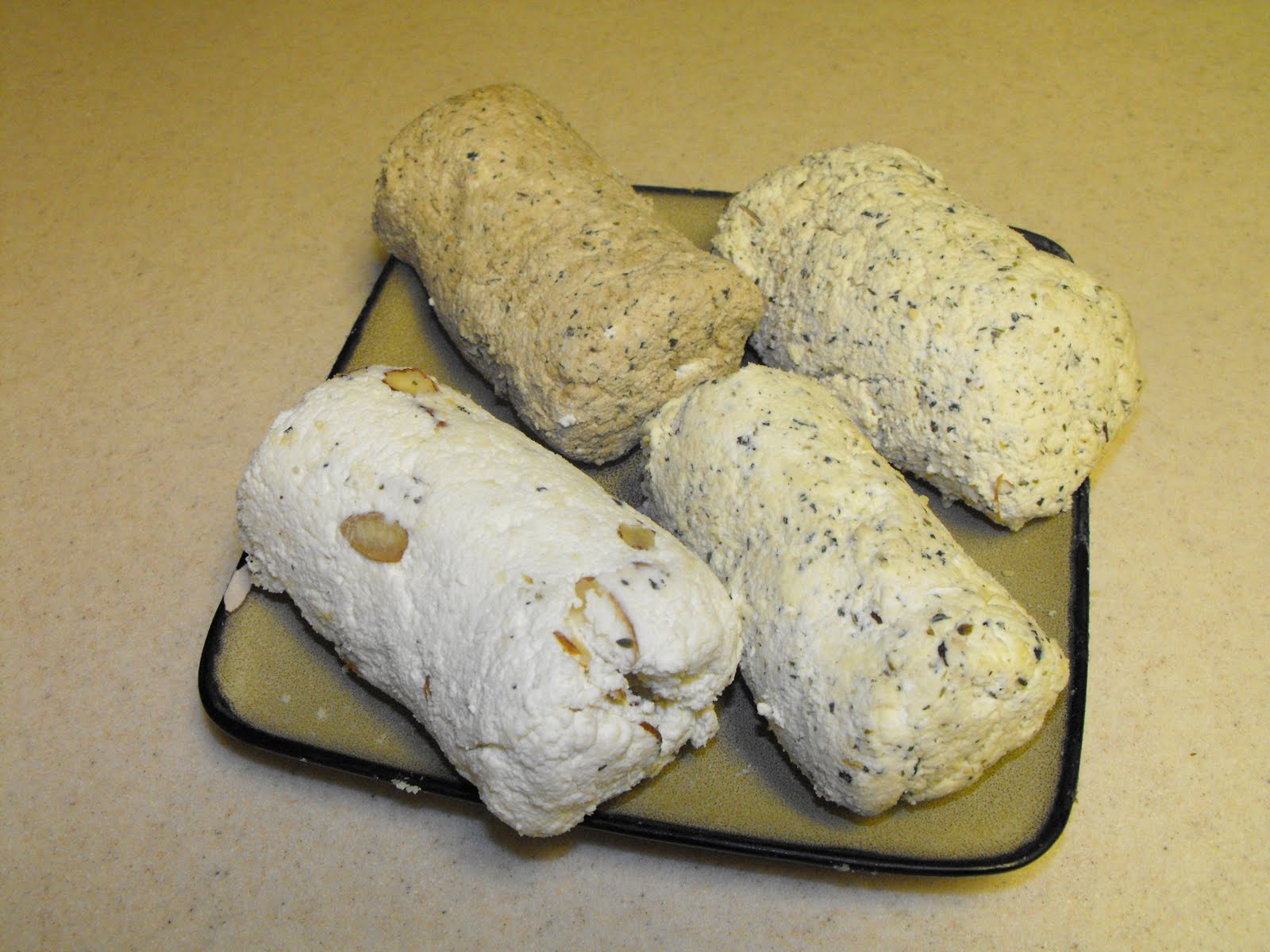 When I formed the first cheese log and tried some, it had more texture to it than I was used to. So, I added a half package of cream cheese to each log. Two gallons of milk made 4 logs. Each was a different flavor. Here there is Malt flavored cheese (my personal favorite), Balsamic flavored cheese (darker color), Italian spice flavored cheese, and finally Italian spice and Red wine vinegar flavor (I got creative). I found that I had to put these in the refrigerator to set for at least 30 minutes.