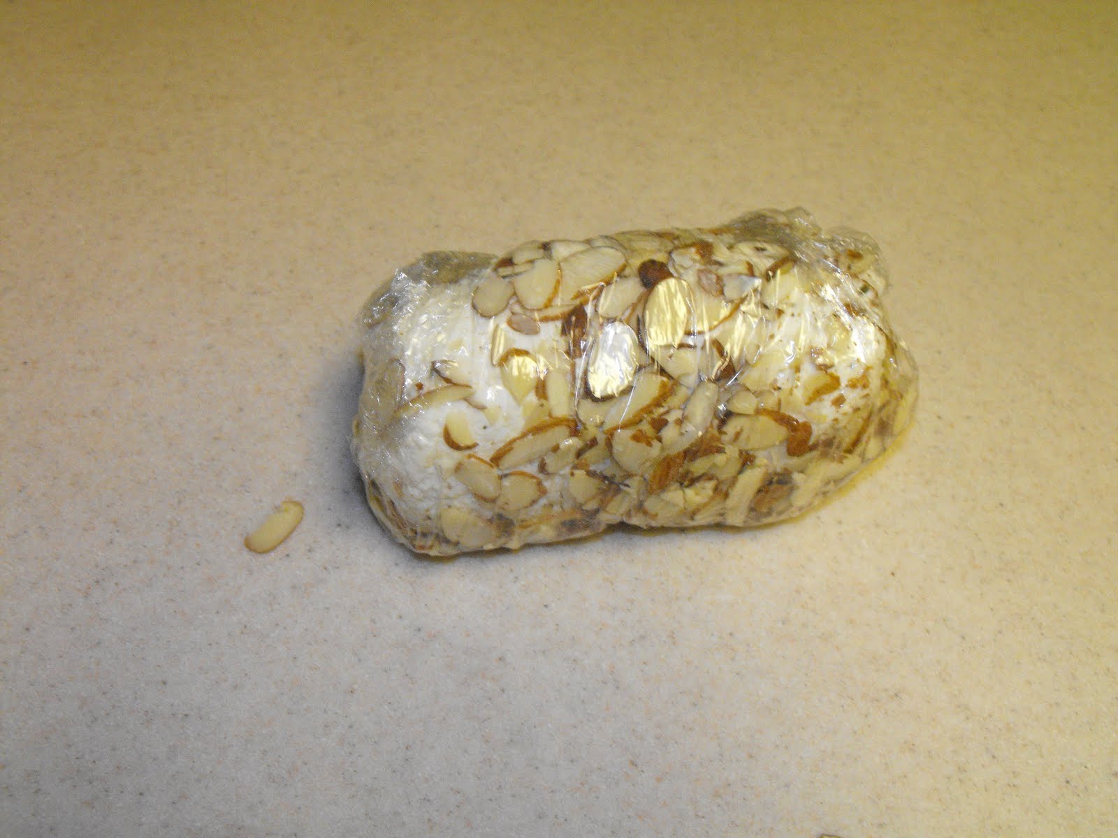 I then rolled the cheese log into the almonds and pressed the nuts into the cheese. I wrapped the log tightly.