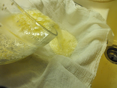 According to Raylene, you need a sturdy cloth for hard cheeses, and she used one for this cheese. Notice that I only put a corner of the cloth in my colander. Pour the contents of the bowl into your cheesecloth-lined strainer. You can capture the whey and use it for other purposes by placing a bowl underneath your colander.