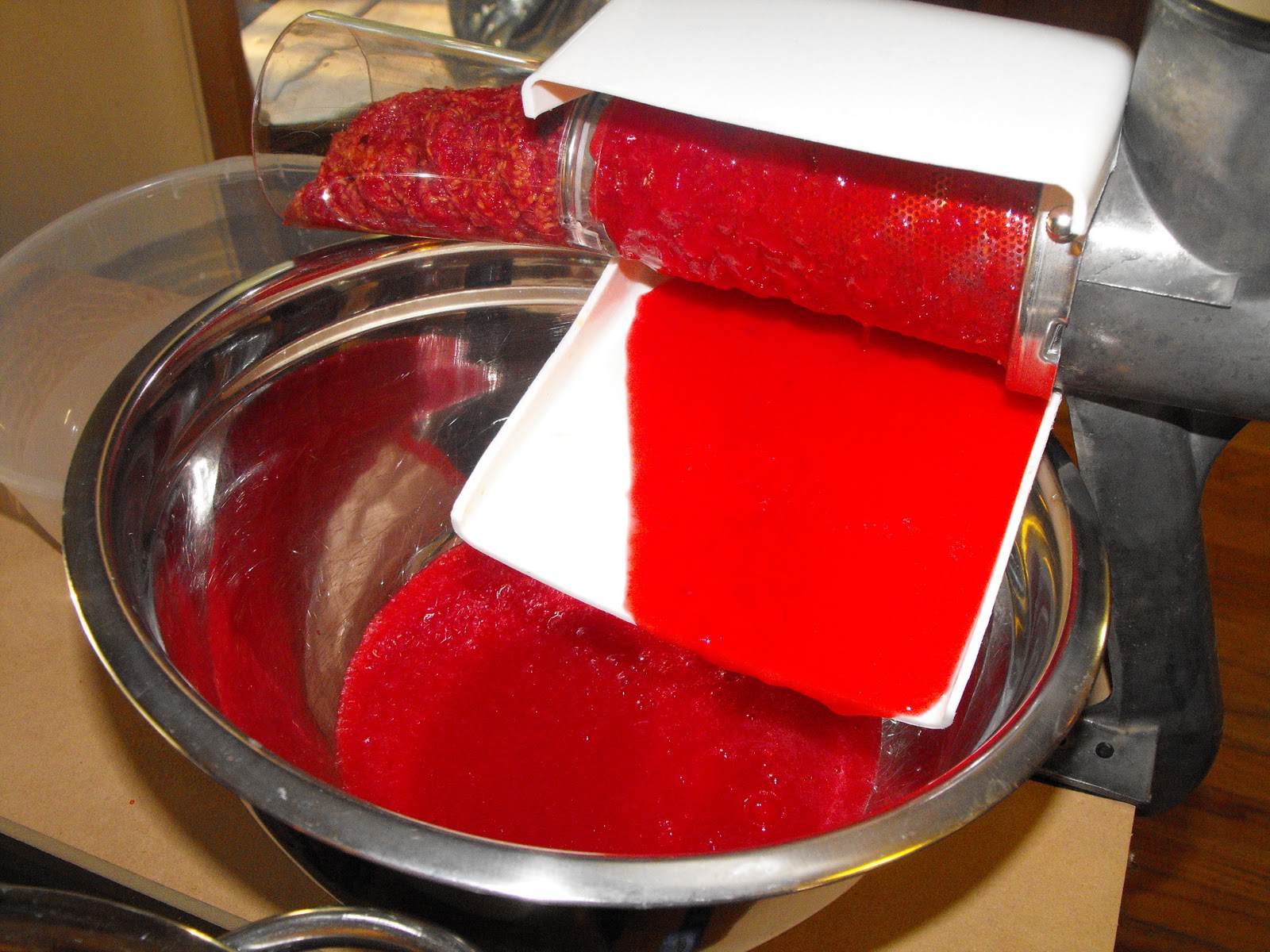 Then I turned the handle. See the berry juice/pulp coming down the slide and the seeds etc going out the left side of the picture? I decided to put the 'waste' pulp through the strainer a couple of times to capture all the juice I could. Isn't it a pretty color?