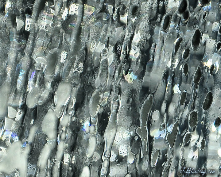 The photo below, unmodified except for resizing and adding my name, was taken during a car wash in Appleton, Wisconsin, back when we still had cars. Now we're carless, living in China. The foam looked interesting so I whipped out my camera and took a shot as my dirty vehicle was being cleaned. It was cool, but the real beauty was in the details when I looked at the image later. When I zoomed in to different parts of the image, as shown in the two other enlargements below, the interplay of light, water, and foam on the mirror was really delightful.