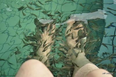 Fish therapy: this is a warm pool with lots of doctor fish that eat dead skin off feet. Shown below are a couple of feet being processed. Such a strange feeling. Made it hard not to giggle, it was so ticklish.