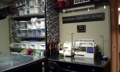 You can see she has her sewing machine and Serger set up and ready to go. See the line of scissor to the left of her serger? This is a magnetic strip that holds them for her. She has a little bulletin board just above the scissors for to hold notes or instructions.