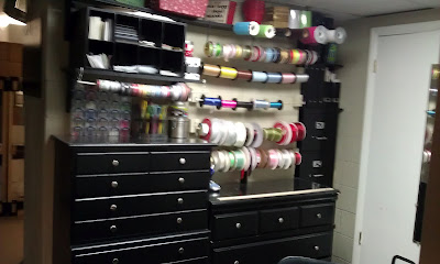 This is the view just behind her sewing area. She took two old dressers and painted them black, and hung a peg board to hold her ribbon on cables. See the file cabinet to the far right. Now you may ask, what does she have in the drawers.....want to see?