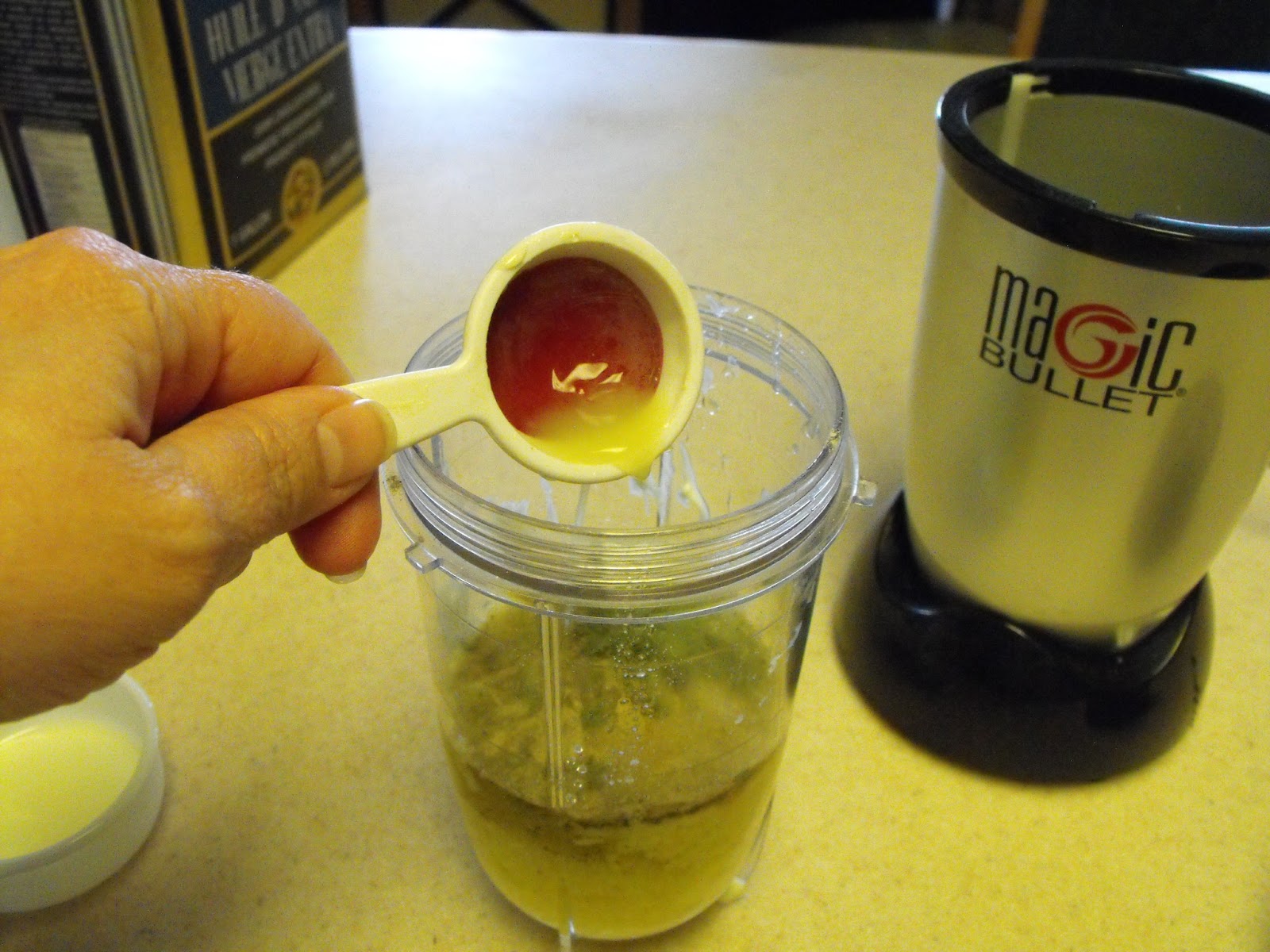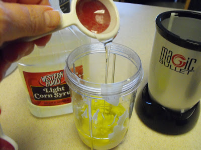 I decided to use my Magic Bullet for this purpose. Not only does it mix the dressing quickly, it has a screw on cap for easy transport from my house to the "Break-the-Fast" meal. I put in the Mayo, the Olive Oil, and an ingredient that was a surprise to me.....Corn Syrup.