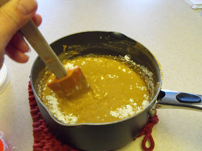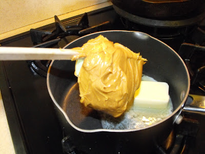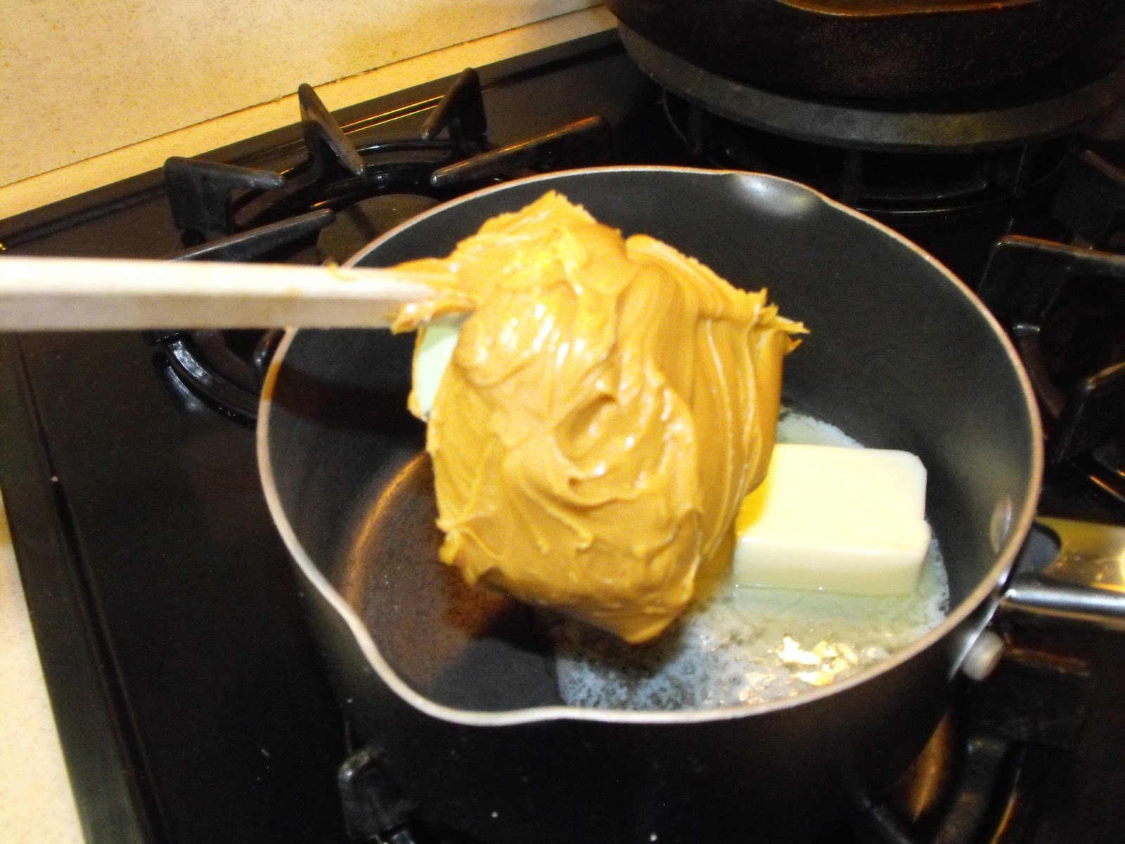 - IN a medium saucepan, combine the peanut butter, butter, and brown sugar over medium heat. Heat until completely melted and starting to bubble a little, stirring constantly. Remove from the heat. add the powdered sugar and 1/4 cup at a time, stirring until completely combined with the peanut butter mixture after each addition. Set aside and let cool to room temperature.