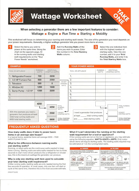Sooo, do you have a Generator? There are so many makes and models, so please do your homework to find out what works for you. Also, consider stopping by Home Depot and picking up one of these Brochures. It's worth your time.