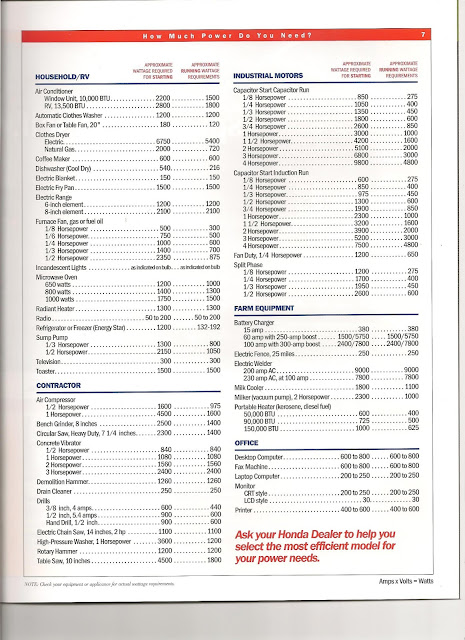 So...does that mean that we have met all our power needs now just because we have this item. Soooo not! You need to know what your generator can run and for how long. How do you figure that out? Well, thanks to our friends at Home Depot, they offer a brochure that allows you to see what it takes to run your fun little appliances by generator.