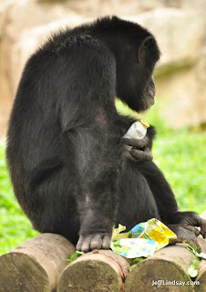 Here's the chimp (click to enlarge). That's an aluminum can in the first photo and, moments later, a plastic bottle in the second.