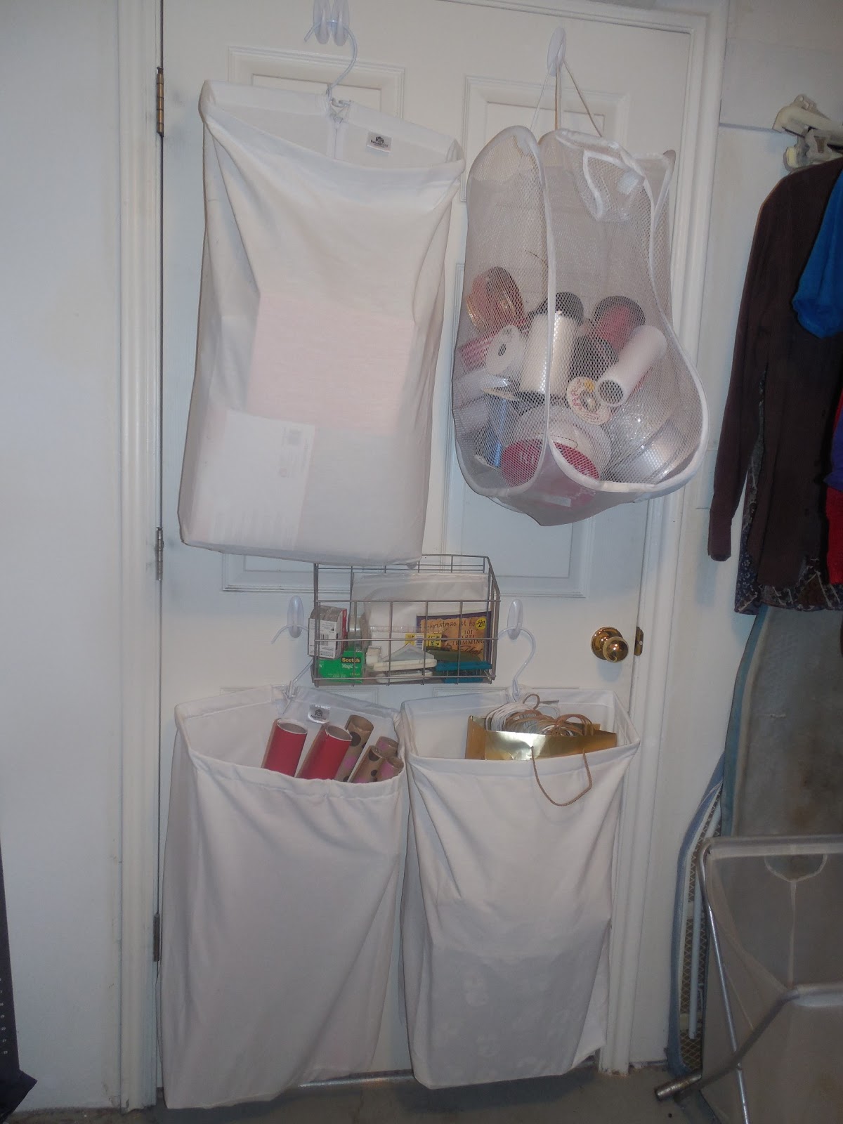 This is the top of the door. In the hamper/organizer on the left, I am storing my gift boxes. I was puzzled with how to store my ribbons etc. I bought a canvas container to put them in, but it just didn't fit the space like I had hoped it would. Enter...a dollar-store find. I used to store my wrapping paper in the mesh hamper/organizer on the right. I am now putting my ribbon in this container as I can see what is in there. It is easy to take down either hamper to access the contents inside. It is just as easy to replace them back on their designated hooks.