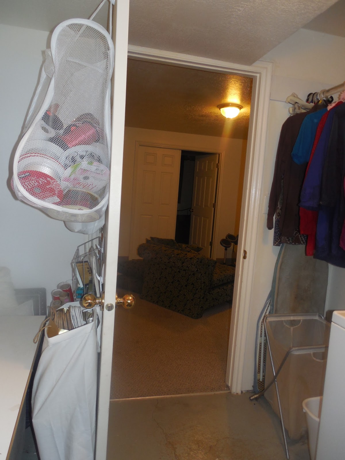 This is the back of the door to my combination laundry room (on the right of the picture) and sewing area (on the left). I saw this very blank door! I used to have "organizing things" screwed into the door to hang my vacuum hoses and attachments. Lets just say that the vacuum that I had that stuff for is long gone. Recently, Rooster Senior took most of the 'organizing things' off the door and is using them in the garage...which Rooster Junior is helping to clean and organize.