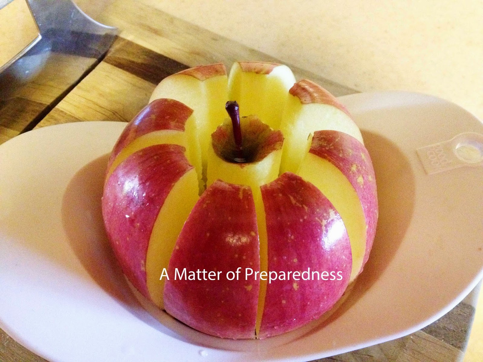 So far, we have discussed using Frozen, Canned, Dry Packed, and Dehydrated foods for this meal. In my Cold Storage (my 2nd refrigerator), I retrieved apples and sliced them with this handy device that most people think is only for canning. Not around here!