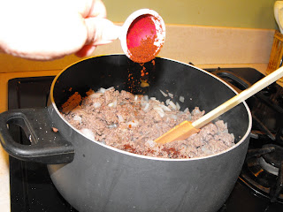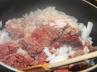 I choose to use extra, extra lean beef as I hate to pay for something I am going to have to discard. I also sliced my onions and put them in. The recipe also calls for chopped peppers, but Rooster Jr. has a severe dislike for peppers, so I omitted them.