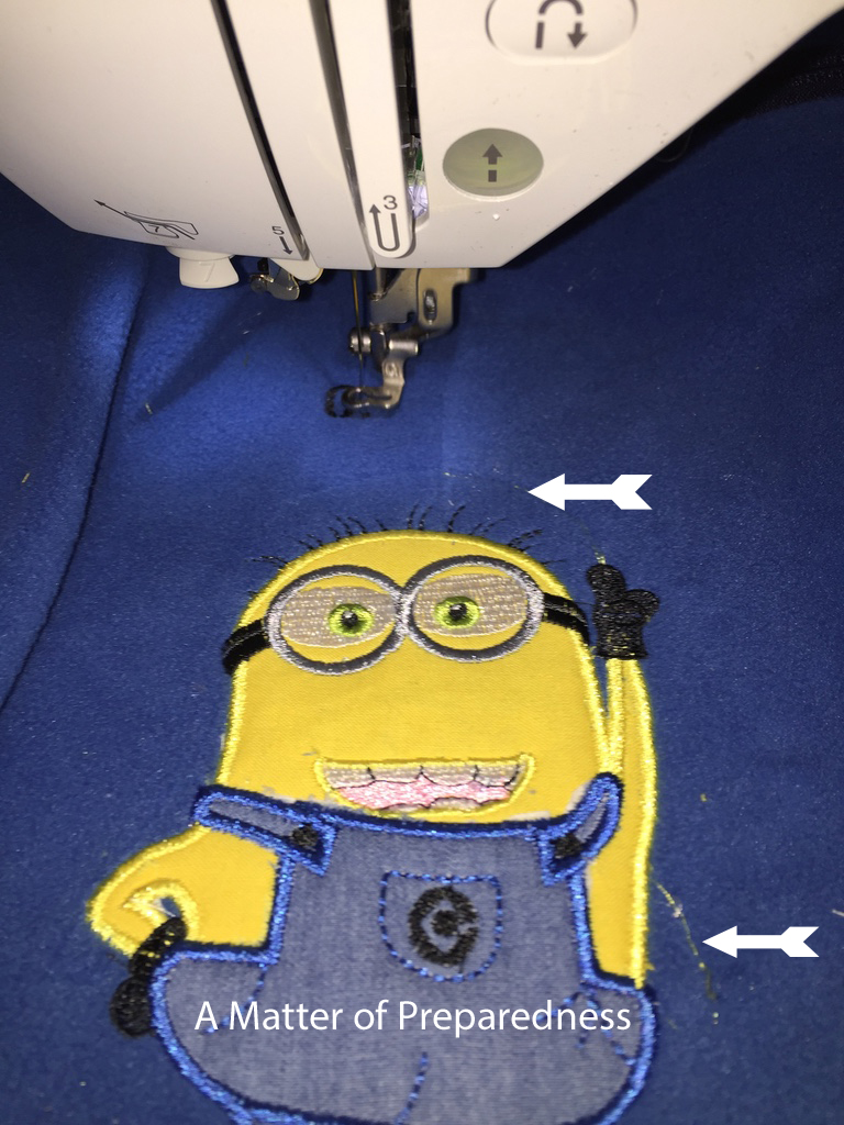 I did have to unpick the areas that were not covered. However, the task was much less than it would have been if I had tried to remove the entire stitching error area before adding the correct embroidery pattern. It only took a few minutes. I always try to unpick from the underside. With a material like fleece, it was easier to see the stitches and remove them.