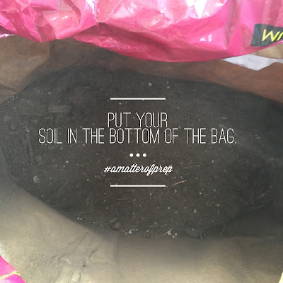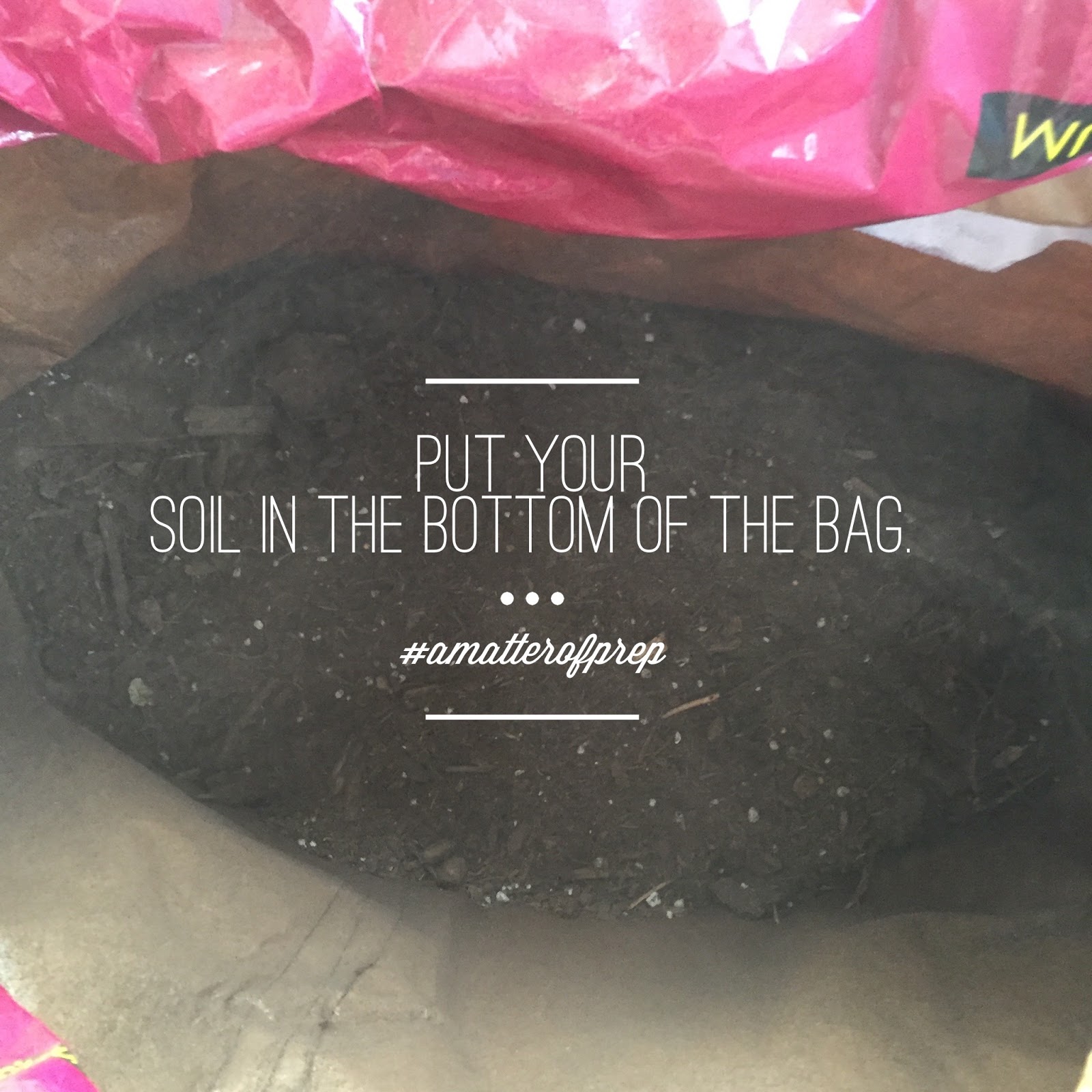 I had some potting soil that was not used in my original planting this year. I put it into the bottom of the bag. I did not cut holes to allow water to flow out. As the Potatoes grow, I may do that in the future.