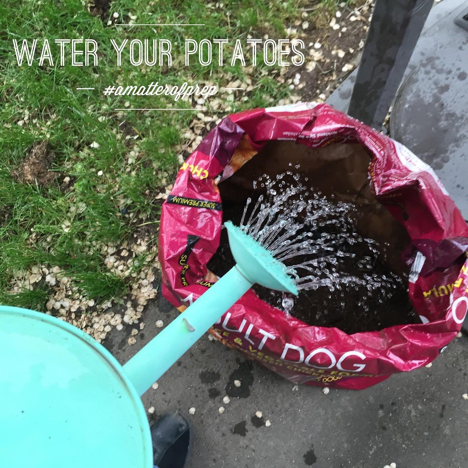 I put another layer of soil to cover the potatoes. Then, I watered them. It has been rather rainy since I planted these, so I placed the bag just under the roof line to give them moisture. Rooster Senior kept pulling the bag out of the rain....trying to be helpful. I put it back hoping that we could still have a crop.