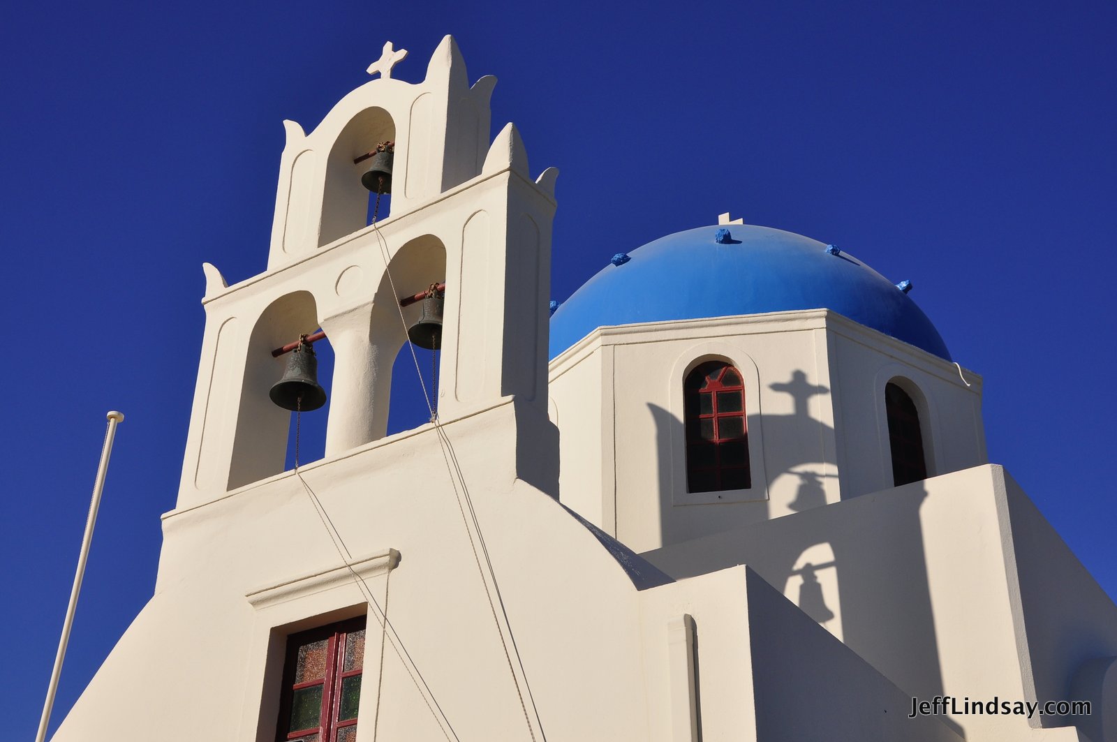 I was almost wondering if now I would have to call off the diving course we were signed up for (shame on you if you are somehow insinuating that there was some degree of reluctance on my part about the whole diving thing that my wife was very excited about doing). But the main wound was healing well by the time we got to Santorini Island in Greece (the place where many of the most popular pro-tourism photos from Greece are taken) and I figured maybe I'd be OK, maybe, just maybe. Shortly after arriving on Santorini as we walked about the steep streets and rugged steps of Thira (Fira), a town on a tall volcanic cliff overlooking the ocean, I took some shots from an elevated view point and then stepped back onto the steep path, only to find myself--here goes my gravitational profile again--suddenly falling due to an uneven step that wasn't where I expected it to be. I fell with my SLR camera hanging in front of me (it may have blocked my view of the gap I was stepping onto), which hit the ground hard. I was worried that it would be ruined, though it was OK--just needed a reset by taking the battery out for a second.