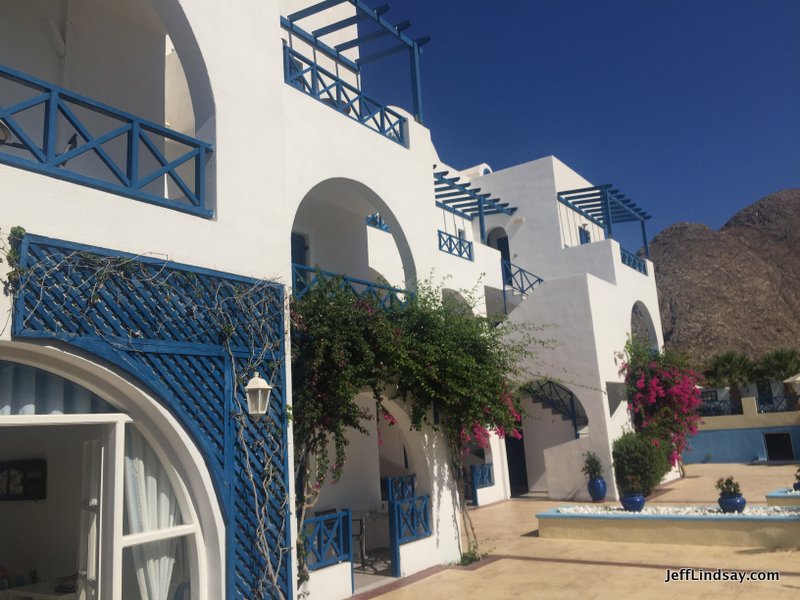 More surprising Greek kindness was encountered near the end of our Santorini stay as we moved to a little hotel in Perissa, closer to the Santorini Dive Center (the only dive center there with real on-shore facilities like a bathroom, shower, tables in the shade, etc.). The manager there, Margarita, was so warm and kind, it just amazed me. In fact, when she learned that were going to take the long walk down to the main beach in Perissa to eat at the place she recommended, she gave us a ride in her car, then introduced us to the owner of the restaurant (Fillippo at Fillippo's Restaurant), and arranged for Fillippo's wife to give us a ride back when we were done. These Greeks just wowed me with their friendliness and willingness to help. The food was impressive as well.