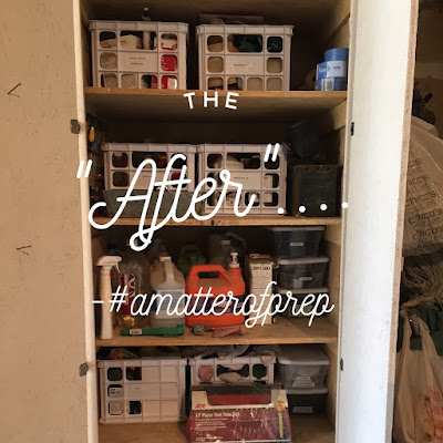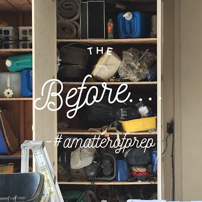 See the bags, boxes and items placed in the cabinet without rhyme or reason (to me anyway). So, because of Rooster Senior's generosity, I decided (at my own peril) to try to be helpful by organizing some of the Garage cabinets.