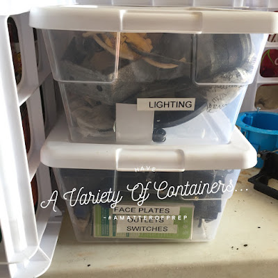 For smaller containers, I used the label maker to identify large categories and some with a sorted but similar items. "Lighting" items in the top box, and other items associated in the lower box. Each type of item is listed on the outside of the box.