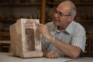 | Professor Garfinkel points to a portion of the stone model of the First Temple. |