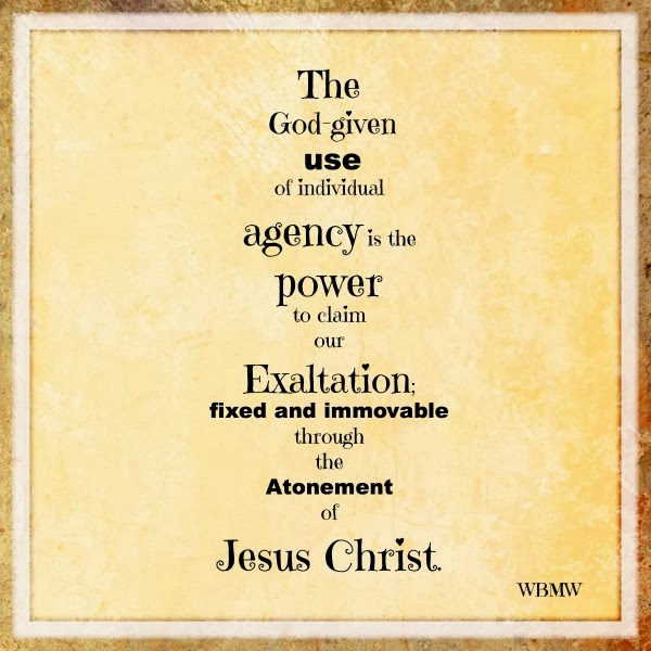 The God-given use of individual agency is the power to claim our Exaltation; fixed and immovable through the Atonement of Jesus Christ. Finished. Done. Satan has no authority by which anything he does can affect the victory of Jesus Christ over physical and spiritual death. Nor can Satan's power to influence us to choose evil, take away the ability of a single soul to receive exaltation; unless a person chooses to give Satan their power by choosing him (evil) - the exact opposite of what we all fought for in the war in heaven.