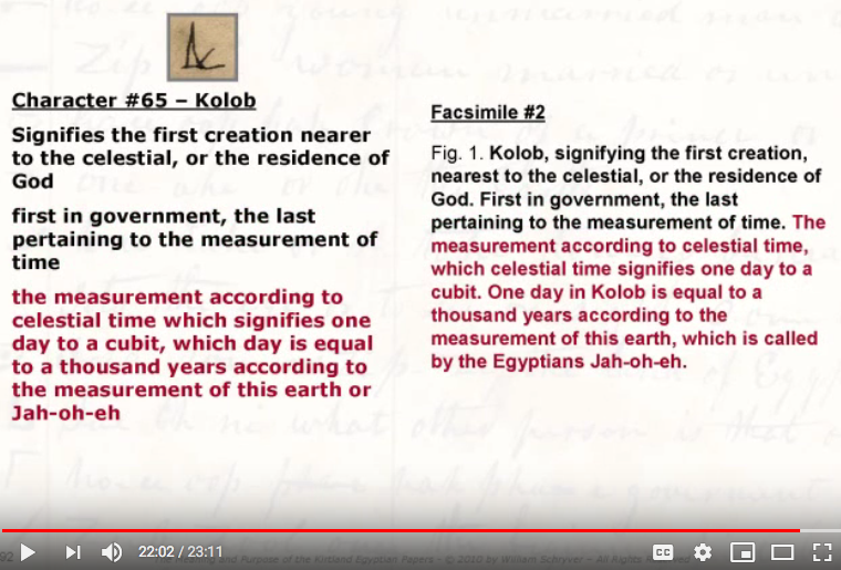 - "Kolob. signifies the first creation nearer to the celestial, or the residence of Lord, first in government, the last pertaining to the measurement of time, the measurement according to celestial time which signifies, one day to a cubit which day is equal to a thousand years according to the measurement of this Eearth or Jah=oh=eh" [cf. commentary for Facs. 2, fig. 1]