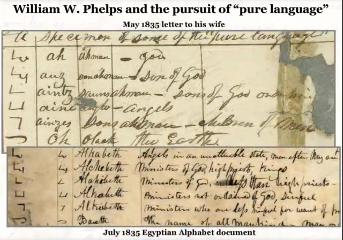 Schryver argues persuasively that this rules out the idea that his document was intended to turn Egyptian into English, but was part of a cipher key for turning English into code, or even into "pure language" which Phelps and others may have believed was what ancient Egyptian sort of was. Thus, work on this cipher key, for turning English into code, could well have been viewed as "translating" and as work aiming at developing a "pure language" or, in a sense, "Egyptian," but without the need for actual Egyptian characters from any scroll. Indeed, some of the characters in the Kirtland Egyptian Paper are Sanskrit, Masonic ciphers, variations of Arabic numbers, composite characters, etc., along with many Egyptian characters.