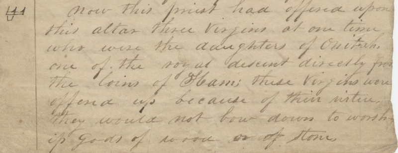 now this priest had offered upon this altar three Virgins at one time who were the daughters of Onitah, one of the royal descent directly fro[m] the loins of Ham; these Virgins were offered up because of their virtue, they would not bow down to worship gods of wood and <or of> stoneOne speculative theory might be that Phelps saw this character as somehow related to the name Onitah, and saw it as characterized by having three vertical lines rising from a baseline. If so, he may have seen a relationship to one of his Egyptian characters that would be in roughly the "right place" (my opinion) for the occurrence of the name Onitah in his translation. Yes, speculative.